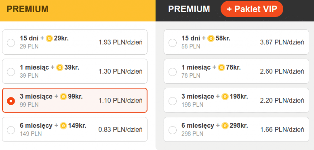 Cena konta premium oraz VIP